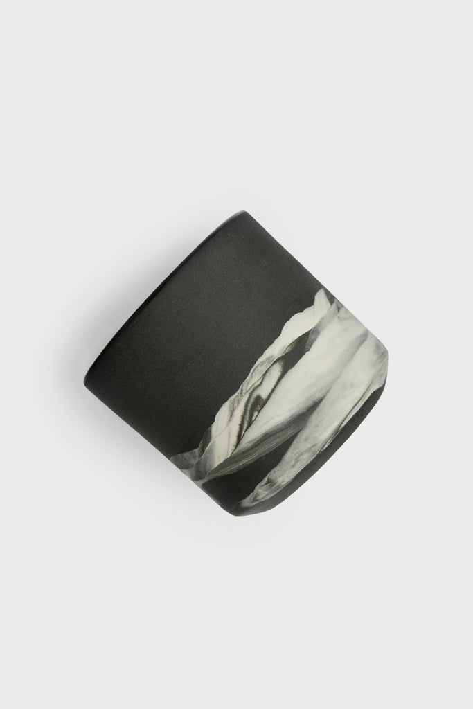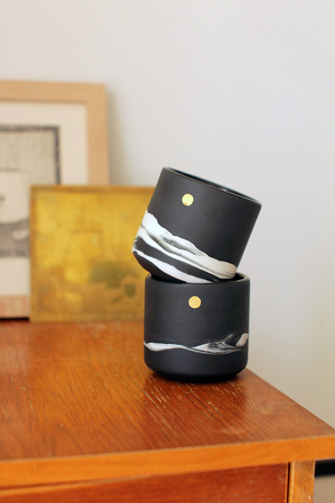 Чорний стакан об'ємом 300 мл з мотивами засніженого зимового пейзажу. Призначений для подачі щоденних напоїв. Посуд виготовлений з міцного матеріалу - порцеляни. Має сонечко, розписане справжнім золотом.